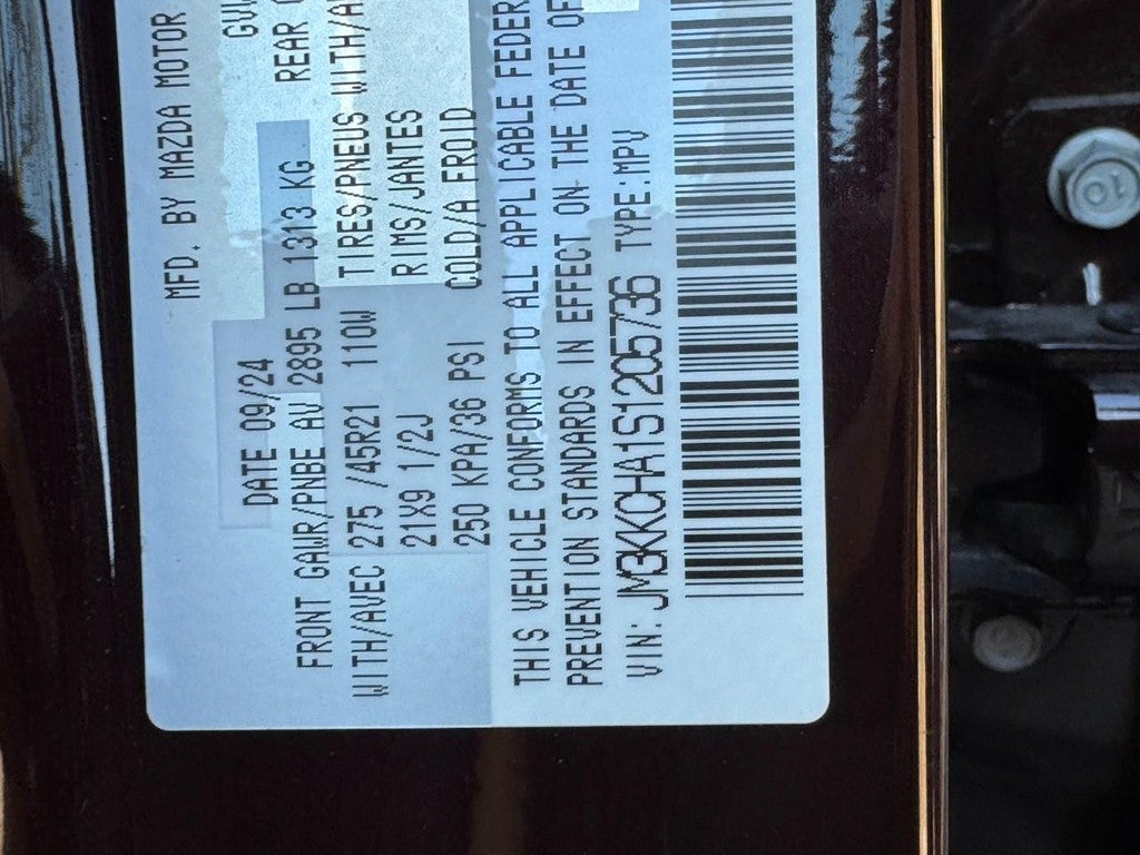 Mazda Certified Pre-Owned Certified, 2.5L 4-Cylinder, 12 Speakers, 2nd-Row Captain's Chairs, 3rd row seats: bench, 4-Wheel Disc Brakes, ABS brakes, Air Conditioning, Alloy wheels, AM/FM radio: SiriusXM, Artisan Red Premium Paint Charge, Auto High-beam Headlights, Auto-dimming Rear-View mirror, Automatic temperature control, Brake assist, Bumpers: body-color, Compass, Delay-off headlights, Driver door bin, Driver vanity mirror, Dual front impact airbags, Dual front side impact airbags, E911 Automatic Emergency Notification, Electronic Stability Control, Emergency communication system: MAZDA CONNECT, Exterior Parking Camera Rear, Four wheel independent suspension, Front anti-roll bar, Front Bucket Seats, Front Center Armrest w/Storage, Front dual zone A/C, Front reading lights, Fully automatic headlights, Garage door transmitter: HomeLink, Heads-Up Display, Heated door mirrors, Heated Front Bucket Seats, Heated front seats, Illuminated entry, Infotainment System Voice Command, Knee airbag, Leather Seat Trim, Leather Shift Knob, Leather steering wheel, Low tire pressure warning, Mazda Connected Services, Mazda Navigation System, Memory seat, Navigation system: MAZDA CONNECT, Occupant sensing airbag, Outside temperature display, Overhead airbag, Overhead console, Pandora Internet Radio Integration, Panic alarm, Passenger door bin, Passenger vanity mirror, Power door mirrors, Power driver seat, Power Liftgate, Power moonroof, Power passenger seat, Power steering, Power windows, Radio Broadcast Data System Program Information, Radio data system, Radio: AM/FM w/HD/Bose 12-Speaker Sound System, Rain sensing wipers, Rear air conditioning, Rear anti-roll bar, Rear reading lights, Rear seat center armrest, Rear window defroster, Rear window wiper, Remote keyless entry, SMS Text Msg Audio Delivery & Reply, Speed control, Speed-sensing steering, Split folding rear seat, Spoiler, Steering wheel mounted audio controls, Tachometer, Telescoping steering wheel, Tilt steering wheel, Traction control, Trip computer, Turn signal indicator mirrors, Variably intermittent wipers, Wheels: 21" x 9.5J Aluminum Alloy, 2.5L 4-Cylinder.